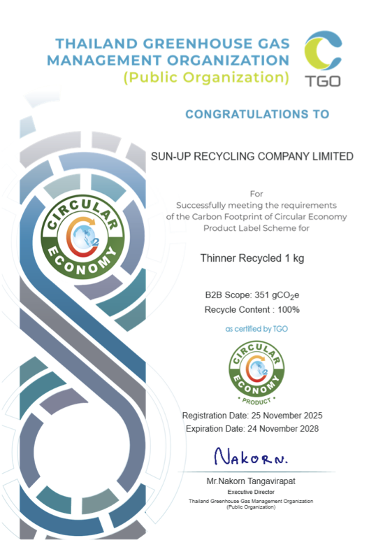 บริษัท ซัน-อัพ รีไซคลิง จำกัด ได้รับการรับรองคาร์บอนฟุตพริ้นท์ของผลิตภัณฑ์ (Carbon Footprint of Product: CFP) ซึ่งเป็นการประเมินปริมาณการปล่อยก๊าซเรือนกระจก (GHG) ของผลิตภัณฑ์ตลอดวัฏจักรชีวิต ตั้งแต่การจัดหาวัตถุดิบ กระบวนการผลิต การกระจายสินค้า การใช้งาน และการจัดการของเสียเมื่อสิ้นสุดอายุการใช้งาน รวมถึงการขนส่งที่เกี่ยวข้องในแต่ละขั้นตอนของผลิตภัณฑ์ นอกจากนี้ ยังได้รับการรับรองคาร์บอนฟุตพริ้นท์ของผลิตภัณฑ์ตามแนวคิดเศรษฐกิจหมุนเวียน (Circular Economy Carbon Footprint of Product: CE-CFP) อีกด้วย